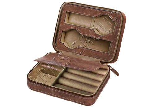 Premium Rust Brown Leather Zippered Jewelry Case With Two Sides Organizer